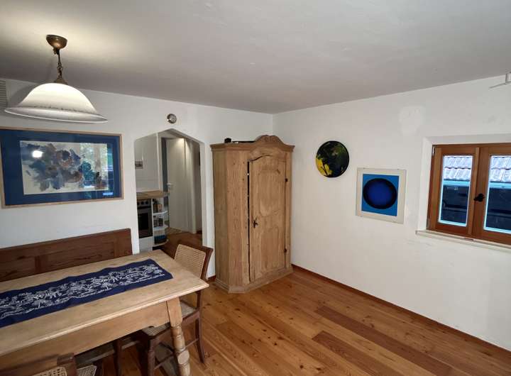 Über die originale Holztreppe erreicht man den ersten Stock, in dem sich zwei Schlafräume, zwei Bäder, eine Küche und ein gemütlicher Ess/Wohnraum mit einem weiteren Holzofen von 2022 befinden.