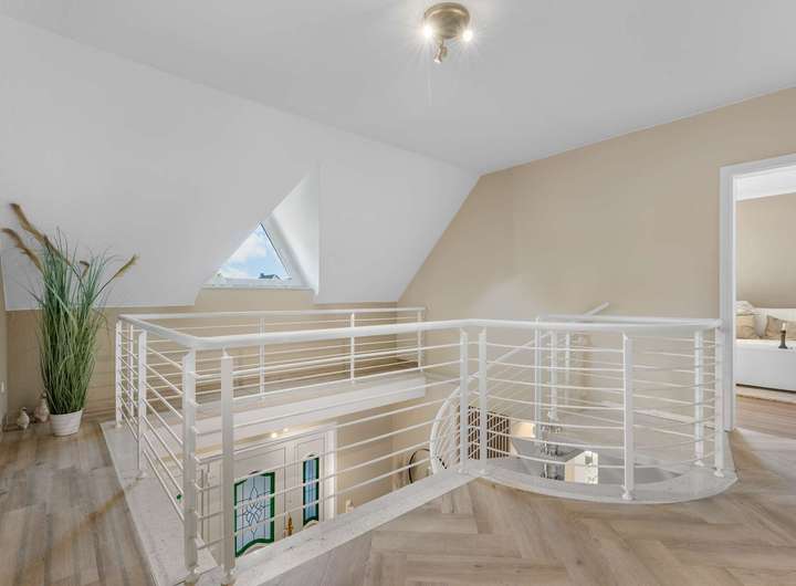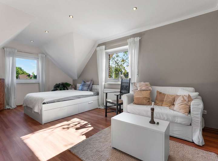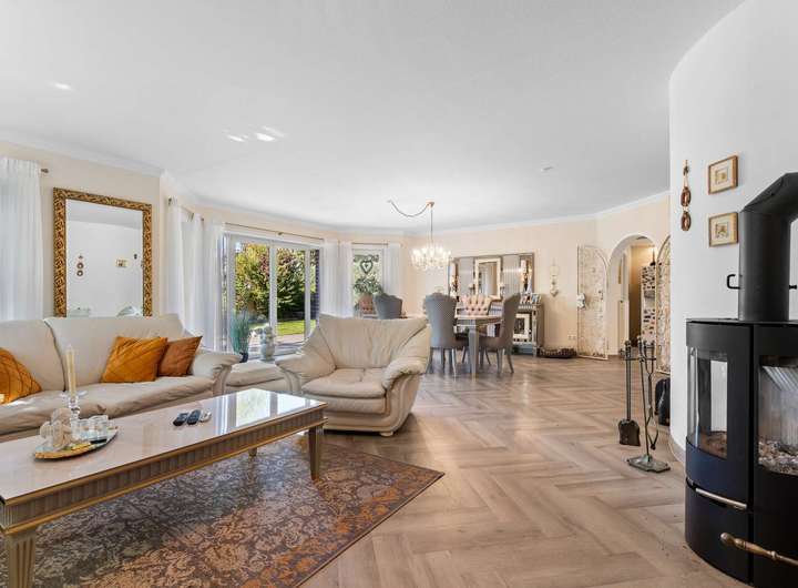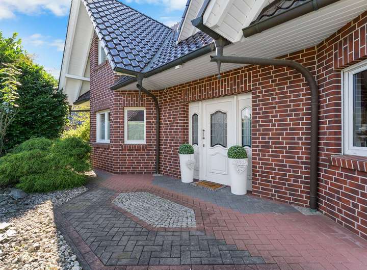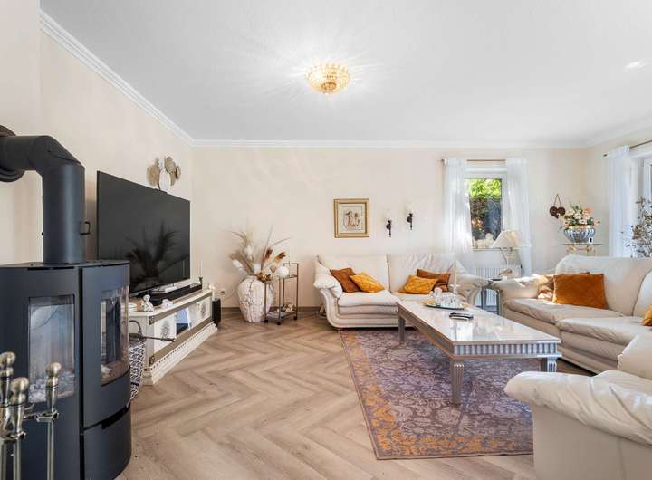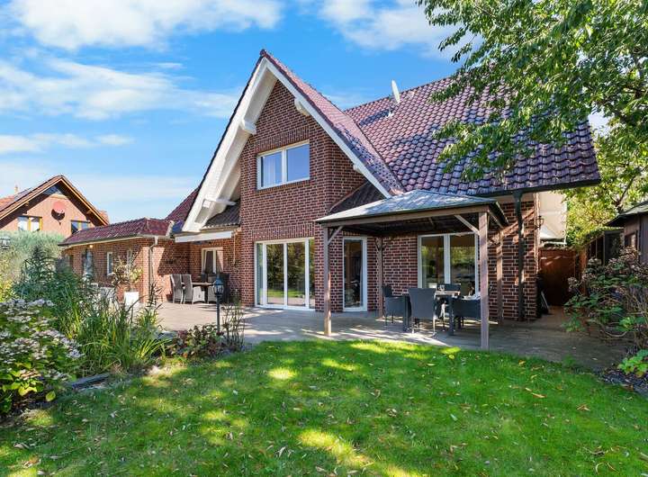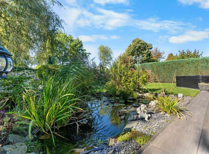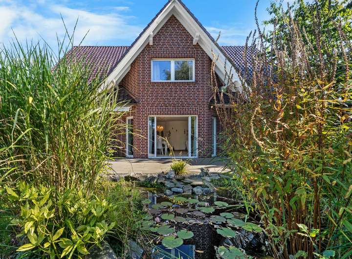 Dieses kürzlich renovierte Einfamilienhaus ist ein echtes Traumhaus für alle, die das Besondere suchen. Mit ca. 240 m² Wohnfläche auf zwei Etagen begeistert es durch einen offenen Grundriss, hochwertige Ausstattungsdetails und eine traumhafte Lage. Eingebettet in eine ruhige Stichstraße in gepflegter Nachbarschaft bietet die Immobilie die perfekte Kombination aus Privatsphäre, Naturverbundenheit und kurzen Wegen ins Stadtzentrum. Das einmalig gelegene Grundstück überzeugt mit einem nicht einsehbaren, wunderschön angelegten Garten samt idyllischem Teich. Direkt angrenzend befindet sich ein Regenrückhaltebecken, auf dem Enten ihre Bahnen ziehen. Besonders aus dem Hauptschlafzimmer der oberen Etage bietet sich dieser traumhafte Ausblick – hier beginnt jeder Tag mit einem Blick ins Grüne. Schon beim Betreten des Hauses empfängt Sie eine großzügige, bis ins Obergeschoss geöffnete Diele, die ein Gefühl von Luxus und Weite vermittelt. Das riesige, lichtdurchflutete Wohn- und Esszimmer mit fantastischem Blick in den Garten bildet das Herzstück des Hauses. Hier sorgt ein hochwertiger Kaminofen der Marke Aduro für behagliche Wärme und eine gemütliche Atmosphäre – ein echtes Highlight in den kälteren Monaten. Die separate Küche ist mit einer hochwertigen weißen Lackküche, Frühstückstresen, modernen Elektrogeräten und praktischen Auszügen ausgestattet. Direkt angrenzend befindet sich der Hauswirtschaftsraum, von dem aus Sie Zugang zur großen Doppelgarage mit integrierter Werkstatt haben – besonders praktisch, um Einkäufe oder Gepäck direkt und trocken ins Haus zu bringen. Auf der gegenüberliegenden Seite des Erdgeschosses ergänzen ein modernes Gäste-WC sowie ein Büro- oder Gästezimmer mit flexibler Nutzungsmöglichkeit das Raumangebot. Im Obergeschoss erwarten Sie drei großzügige Schlafzimmer, eines davon mit eigenem Ankleidezimmer. Das neu sanierte Familienbad überzeugt mit bodengleicher Dusche, Badewanne, Doppelwaschbecken und stilvollen Fliesen – eine wahre Wellnessoase im Alltag. Das Hauptschlafzimmer bietet neben dem Ankleidebereich den direkten Blick auf das Regenrückhaltebecken – ein Naturidyll, das zu jeder Jahreszeit für besondere Momente sorgt. Darüber hinaus eröffnet ein riesiger, ausbaufähiger Dachboden zusätzliche Möglichkeiten zur individuellen Gestaltung. Der Außenbereich ist ein wahres Paradies. Das ca. 738 m² große Erbpachtgrundstück (Halbjahresgebühr nur ca. 550 €) bietet einen gepflegten, nicht einsehbaren Garten mit Teich, zwei Gartenschuppen und mehreren liebevoll angelegten Vogelvolieren. Eine große Auffahrt führt Sie direkt zum Haus und rundet den repräsentativen Charakter dieser besonderen Immobilie ab. Hochwertige Ausstattungsmerkmale wie Fußbodenheizung, elektrische Rollläden, eine Alarmanlage, eine sonnige Süd-West-Terrasse sowie die große Doppelgarage mit angrenzender Werkstatt und WC unterstreichen den exklusiven Anspruch des Hauses. Dieses Einfamilienhaus ist weit mehr als nur ein Zuhause – es ist ein Rückzugsort, der Großzügigkeit, Komfort und Naturerlebnis harmonisch verbindet. Ein einzigartiges Wohnensemble für Familien und Paare, die Wert auf Qualität und Lebensqualität legen. Lassen Sie sich von diesem besonderen Angebot begeistern und vereinbaren Sie noch heute Ihren persönlichen Besichtigungstermin – denn Traumhäuser wie dieses sind selten und schnell vergeben.