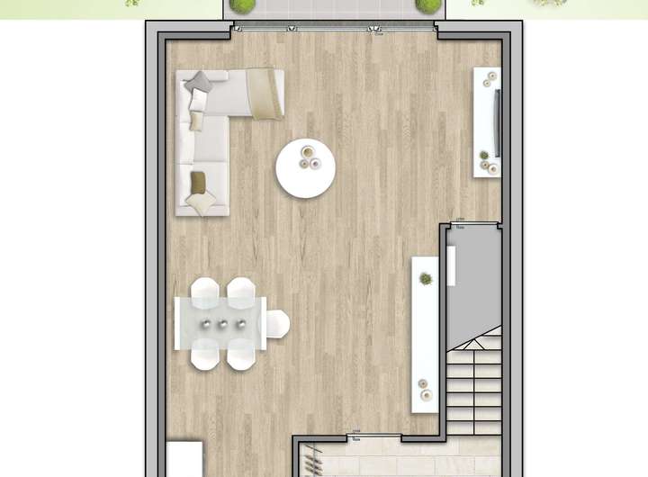Das Erdgeschoss empfängt Sie mit einer geschlossenen Diele, in der eine praktische Garderobennische Platz für Jacken und Schuhe bietet. Von hier aus gelangen Sie in den großzügigen, offen gestalteten Wohn-, Ess- und Kochbereich mit hochwertiger Einbauküche. Große Fensterflächen sorgen für ein lichtdurchflutetes Wohnambiente. Ergänzt wird das Erdgeschoss durch ein Gäste-WC sowie einen Abstellraum unter der Treppe.