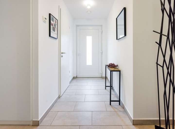 Robuste Vinylböden in warmer Holzoptik sorgen in allen Wohnräumen für ein stimmiges Gesamtbild und sind dabei besonders pflegeleicht. Die Wände sind mit hochwertigem Malervlies glatt verarbeitet – eine ideale Grundlage für vielfältige Einrichtungsstile.