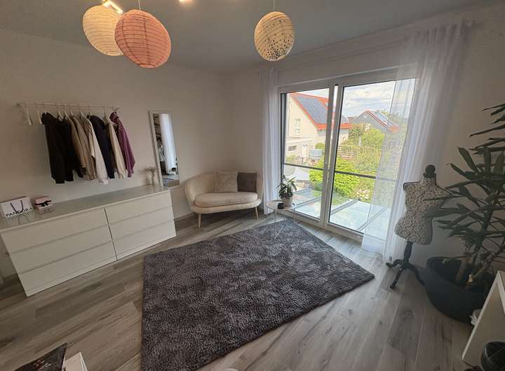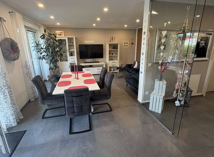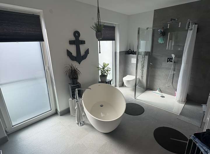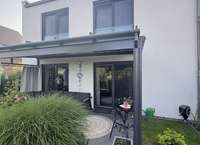 Kubushaus (REH) in moderner Architektur mit höchstem Wohnkomfort- Dieses moderne Kubushaus in Reihenendlage vereint zeitgemäße Architektur mit einem Höchstmaß an Wohnkomfort. Die klaren Linien, die großzügige Raumgestaltung sowie die hochwertige Ausstattung machen dieses Objekt zu einem besonderen Zuhause für anspruchsvolle Käufer. Mit einer Wohnfläche von ca. 140 m² auf zwei Etagen bietet das Haus viel Raum zur persönlichen Entfaltung. Die Deckenhöhe von ca. 2,60 Metern sowie bodentiefe Fenster mit dreifacher Isolierverglasung (innen weiß, außen grau) sorgen für ein helles, lichtdurchflutetes Wohnambiente. Elektrisch betriebene Rollläden in allen Räumen ergänzen die moderne Ausstattung und bieten zusätzlichen Komfort. Erdgeschoss: Beim Betreten des Hauses empfängt Sie ein besonders großzügig geschnittener Eingangsbereich, der einen repräsentativen ersten Eindruck vermittelt. Von hier aus gelangen Sie in ein praktisches Büro, respektive Gästezimmer, das Gäste-WC sowie den Hauswirtschaftsraum, der mit dem Innengerät der Wärmepumpe, einem Wasserspeicher sowie Anschlüssen für Waschmaschine und Trockner ausgestattet ist. Über eine raumhohe Glasschiebetür betreten Sie den ca. 36 m² großen Wohnbereich mit offener Küche. Der lichtdurchflutete Raum überzeugt durch seine moderne Gestaltung und stilvolle Großformatfliesen. Die hochwertige weiße Einbauküche mit Markengeräten der Firma NEFF ist bereits im Kaufpreis enthalten und erfüllt höchste Ansprüche an Funktionalität und Design. Vom Wohnbereich aus gelangen Sie direkt auf die großzügige Terrasse, die mit einer neuwertigen, hochwertigen Terrassenüberdachung ausgestattet ist. Diese verfügt über eine elektrische Beschattung – auch an den Seiten – und lädt zum Verweilen ein. Der angrenzende, pflegeleicht angelegte Garten präsentiert sich als grüne Oase mit liebevoller Bepflanzung. Obergeschoss: Im Obergeschoss erwarten Sie drei geräumige Schlafzimmer mit Flächen zwischen ca. 15 m² und 18,5 m². Alle Zimmer sind mit bodentiefen Fenstern ausgestattet, die auch hier für viel Tageslicht sorgen. Die Schlafräume sind mit einem einheitlichen, hochwertigen Laminatboden ausgestattet. Das stilvoll geflieste Badezimmer bietet höchsten Komfort: Eine freistehende Badewanne, eine großzügige, ebenerdige Dusche sowie moderne Armaturen und ein geschmackvolles Design lassen keine Wünsche offen.
