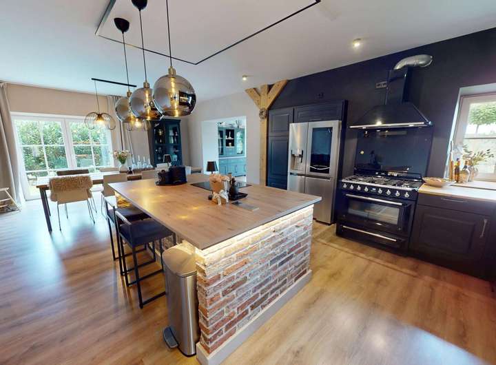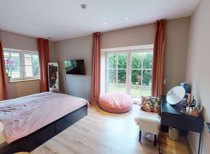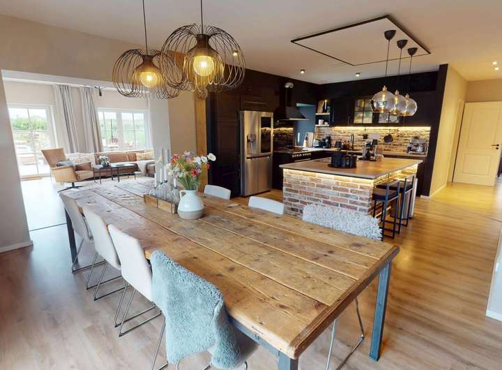 Das Hauptgebäude beherbergt drei vollständig getrennte Wohneinheiten mit einer Gesamtwohnfläche von etwa 287 Quadratmetern. Im Erdgeschoss befindet sich die eindrucksvolle Hauptwohnung mit rund 170 Quadratmetern, die durch ihre offen gestalteten Räume, hochwertige Ausstattung und besondere Details begeistert. Eine moderne Landhausküche von Nobilia mit aufgemauerter Kochinsel aus historischem Klinker, ein Standherd von Smeg im nostalgischen Victoria-Design und ein LG Side-by-Side-Kühlschrank mit App-Steuerung verleihen der Küche ein einzigartiges Flair. Zwei exklusive Bäder, ausgestattet mit italienischen Feinsteinzeugfliesen, ebenerdigen Duschen, einer eingelassenen Badewanne und edlen Armaturen, sorgen für höchsten Komfort. Ergänzt wird das Raumangebot durch fünf großzügige Zimmer, eine lichtdurchflutete Diele mit handgefertigter Loft-Tür und zwei sonnige Terrassen mit hochwertigen Fliesen von Villeroy & Boch.