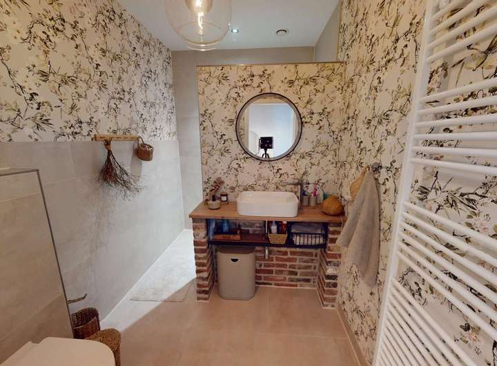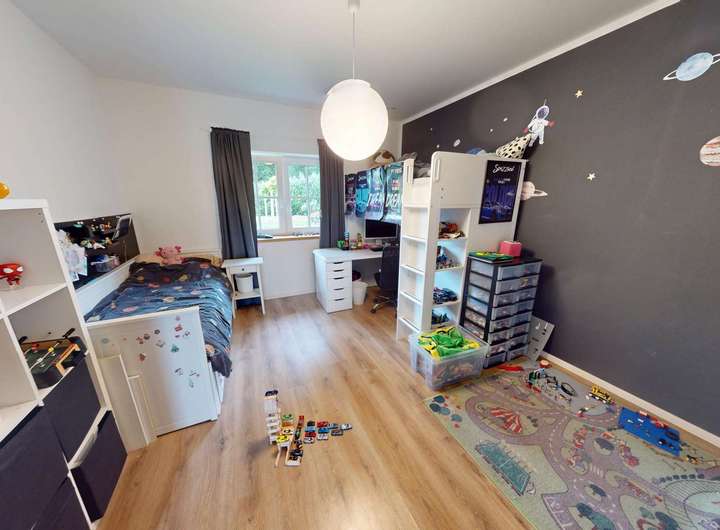 Im Obergeschoss befinden sich zwei weitere, modern gestaltete Wohnungen mit separatem Zugang. Beide verfügen über drei Zimmer, eine offene Balkenlage, eigene Küchen samt Spülmaschinen sowie Anschlüsse für Waschmaschinen und Trockner. Eine der Wohnungen besitzt zudem eine großzügige Dachterrasse, die einen herrlichen Blick ins Grüne ermöglicht. Alle Wohneinheiten sind hochwertig ausgestattet, mit Fußbodenheizung versehen und vollständig autark – ideal zur Vermietung, für erwachsene Kinder, Gäste oder zur Nutzung als Büro- oder Praxisräume.