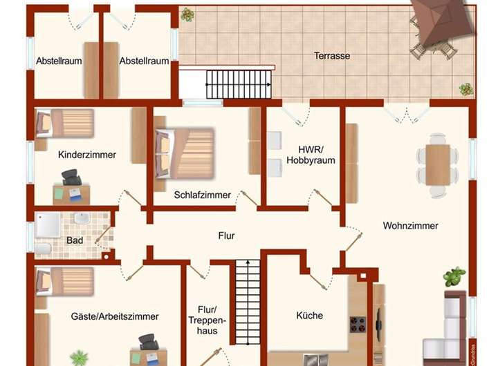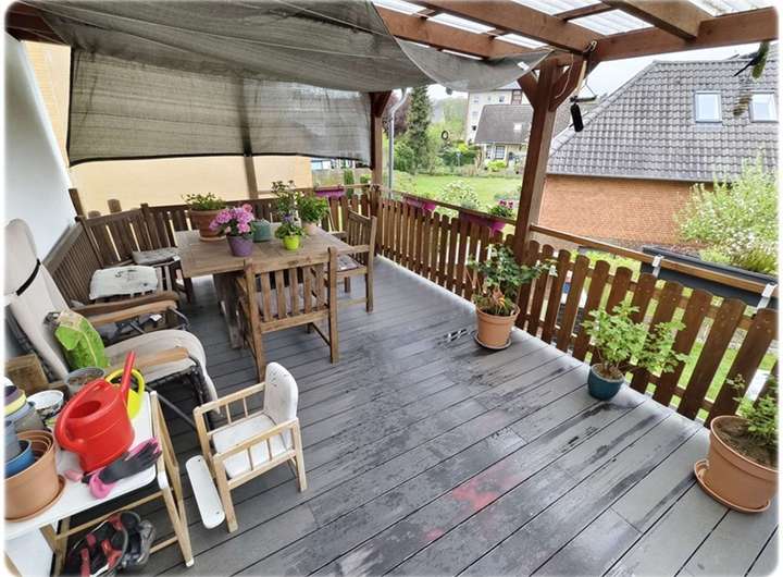 Die großzügige Erdgeschosswohnung erstreckt sich über ca. 126 m² und verfügt über vier individuell nutzbare Zimmer. Ergänzt wird das Angebot durch einen Hobby- und Hauswirtschaftsraum, ein modernes Tageslicht-Duschbad und eine geräumige Küche. Alle Räume sind über einen zentralen Flur zugänglich. Vom Wohnzimmer sowie dem Hauswirtschaftsraum haben Sie direkten Zugang zur ca. 37 m² großen Terrasse und dem Garten, die ideal für gesellige BBQ-Abende sind.