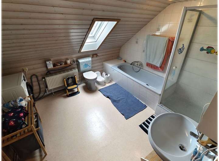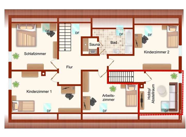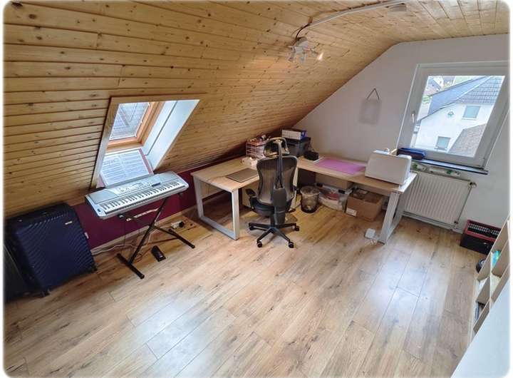 Im Dachgeschoss befinden sich das Schlafzimmer, zwei Kinderzimmer sowie ein Arbeits- und Gästezimmer. Ein großzügiges Bad mit Badewanne, Dusche und Sauna rundet das Raumangebot ab.