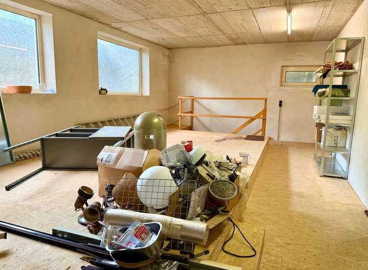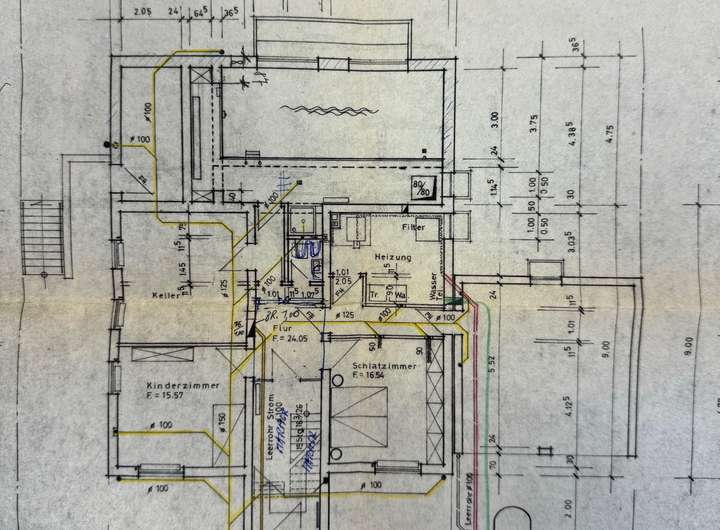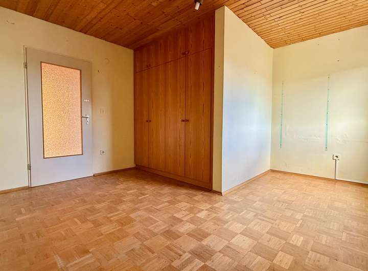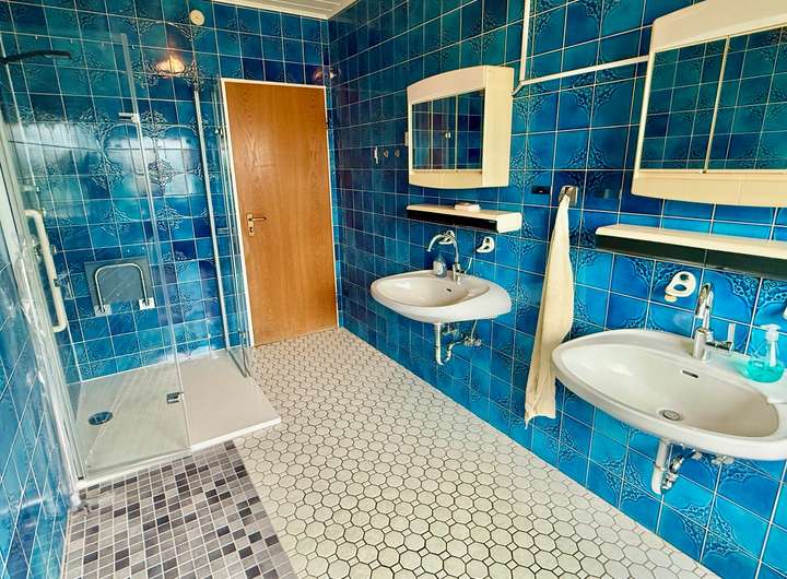 Das Untergeschoss bietet einen ehemaligen Praxisraum (Büro), einen Hauswirtschaftsraum, zwei Schlafzimmer und ein WC. Die hier anzurechnende Wohnfläche beträgt ca. 44 m². Der hintere Bereich ist aufgeteilt in einen Heizungsraum und einen Zugang in die große Doppelgarage mit 2 elektrischen Rolltoren. Besonderes Highlight ist der Schwimmbadraum mit Dusche. Dieser wurde zuletzt genutzt als zweigeschossiger Abstellraum. Das Schwimmbad kann jedoch mit geringem Aufwand in Betrieb genommen werden.