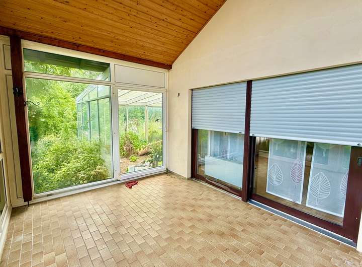Das Erdgeschoss bietet neben dem Treppenhaus eine Küche mit Spind und Durchreiche in das große Ess-Zimmer. Ein Klima-Splittgerät verschafft im Sommer angenehmes Klima. An das Ess-Zimmer angrenzend befinden sich ein großer zweigeschossiger Wintergarten und das große Wohnzimmer. Hinzu kommt ein barrierearmes Bad, ein WC, ein Büro und ein Schlafzimmer. Die Wohnfläche hier wird mit ca. 144 m² angegeben. Vor dem Wintergarten hatten die Besitzer einen weiteren Wintergarten als Gewächshaus angebaut. Dieser kann vielseitig genutzt werden.