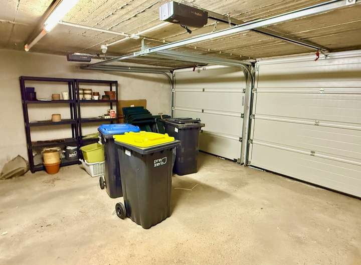 Der Außenbereich ist aufgeteilt in die Garageneinfahrt, Zierbeete, ein weiterer Stellplatz mit Zugang zum Garten und einen von außen begehbaren weiteren Raum im Gebäude, in dem Gartengeräte gelagert werden.