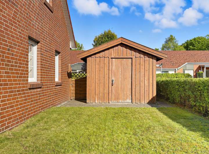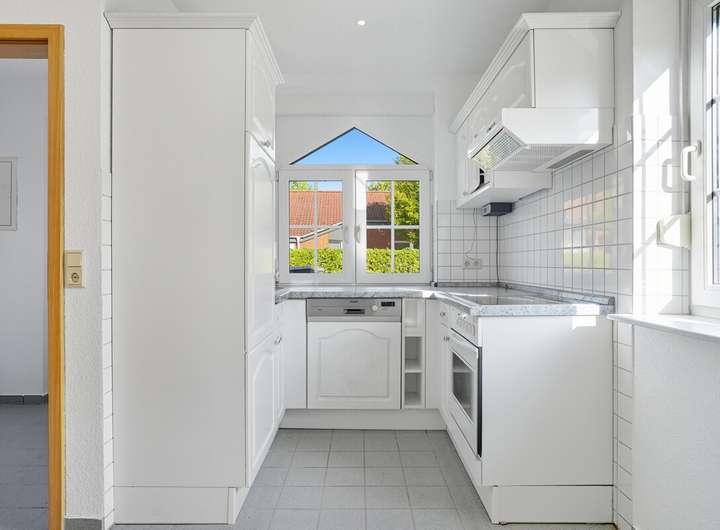 Beim Betreten des Hauses empfängt Sie zunächst ein praktischer Windfang, der in die helle und großzügige Küche führt. Von hier aus gelangen Sie in das geräumige Schlafzimmer, das freundlich gestaltete Badezimmer sowie in das lichtdurchflutete Wohnzimmer. Der Wohnbereich bietet direkten Zugang zur Terrasse und schafft damit einen harmonischen Übergang zwischen Innen- und Außenbereich.