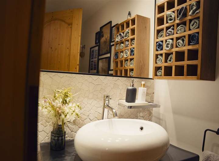 Für Momente der vollkommenen Entspannung bietet die Hofreite eine eigene Sauna, stilvolle Tageslichtbäder sowie eine private Terrasse hinter dem Haupthaus – ein Refugium, das Raum für Stille und Erholung schenkt.