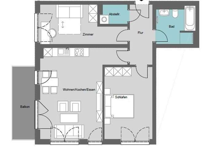 Die Wohnung verfügt über drei Zimmer, eine offene Wohnküche, ein Bad mit Wanne und ebenerdiger Dusche, ein Balkon und einen Abstellraum mit Waschmaschinenanschluss.