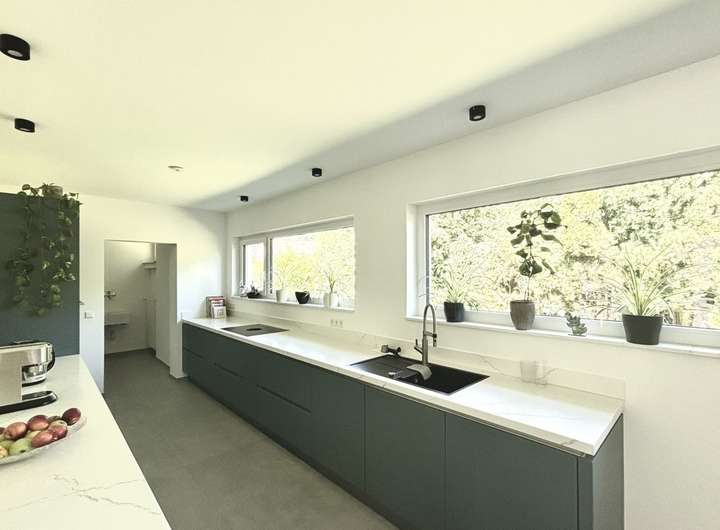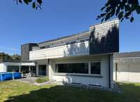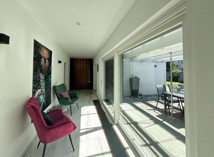 Ob hinsichtlich der weitläufigen Grundstücksgröße oder der besonderen Architektur des Hauses, alles zeigt sich Ihnen bevorzugt. Das Anwesen ist ein idealer Rückzugsort mit geschützter Privatsphäre zum Erholen, Entspannen und Genießen. Die Terrasse „springt“ ins Haus zurück. Mit den großen Fensterelementen ergibt sich dadurch der Atriumcharakter.