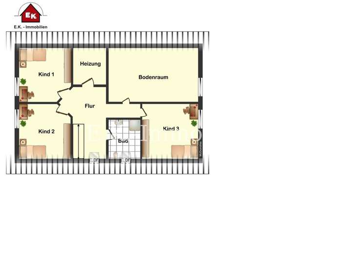 Flur, Badezimmer mit Dusche und WC, Heizungsraum, Kinderzimmer I, Kinderzimmer II, Kinderzimmer III, Ausbaureserve Bodenraum