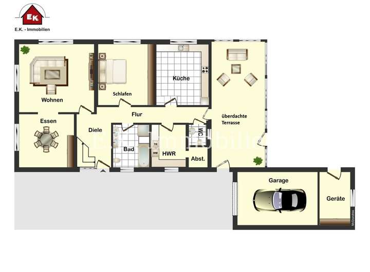 Diele, offener Wohn-Essbereich, Küche, Flur, Schlafzimmer, HWR, Gäste WC, Abstellraum,