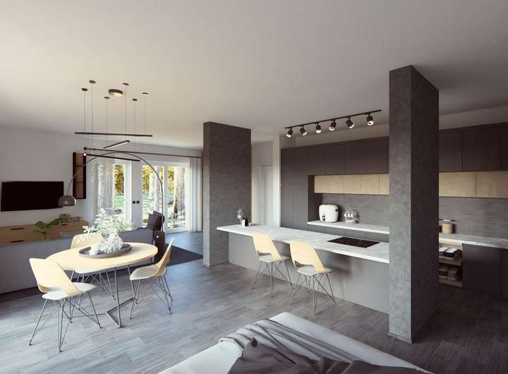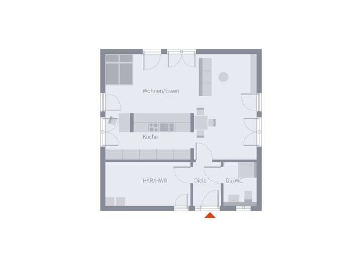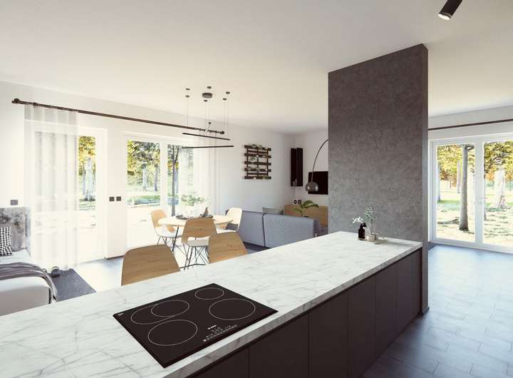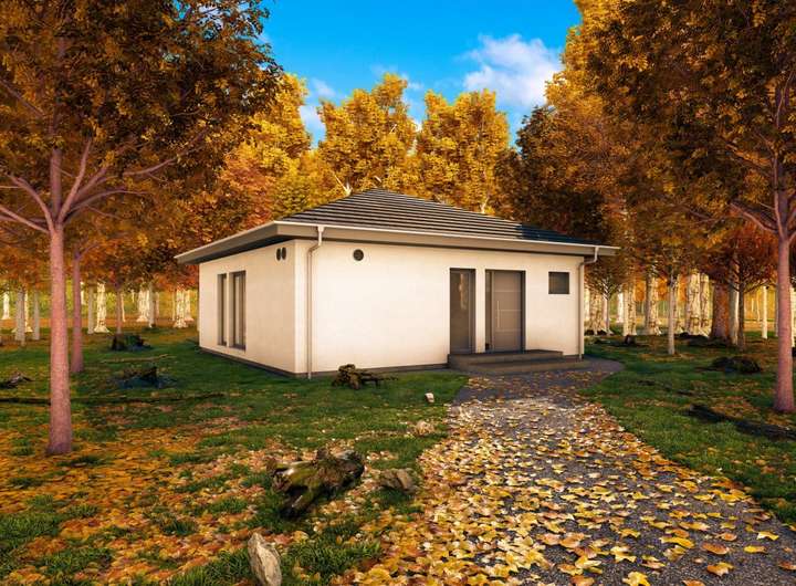 Der Tiny Single Bungalow 3 zeigt, dass komfortables Wohnen auf kleinem Raum durchaus realisierbar ist. Dieses durchdachte Wohnkonzept richtet sich speziell an Singles und Paare, die sich auf das Wesentliche konzentrieren möchten, ohne dabei auf hohen Komfort verzichten zu müssen. Ein besonderes Highlight des Bungalows mit einer Wohnfläche von nur 73 m² ist der offene, lichtdurchflutete Wohn-Ess-Bereich, der nahtlos mit der angrenzenden Küche verbunden ist. Die offene Gestaltung und die fließenden Übergänge schaffen ein angenehmes Raumgefühl. Das kompakte Bad mit Dusche und WC fügt sich harmonisch in das Gesamtkonzept ein, während der Hauswirtschaftsraum ausreichend Platz für moderne Technik bietet - für ein zeitgemäßes Wohnen mit MEHR an Komfort. Bodentiefe Fenster sorgen nicht nur für reichlich Licht im Wohn-Ess-Bereich, sondern ermöglichen auch den direkten Zugang zur Terrasse.