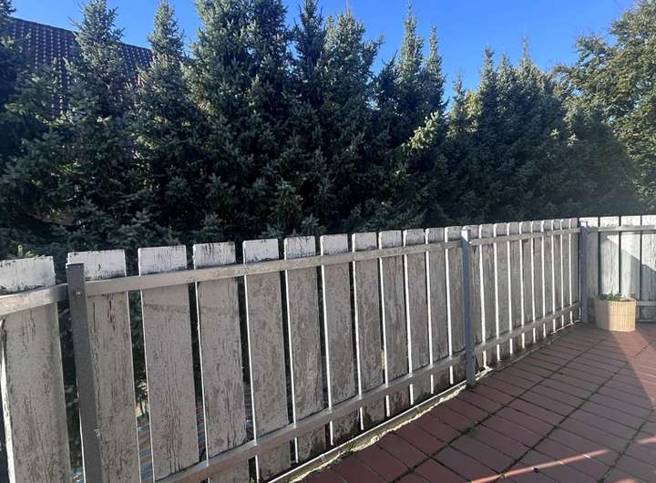Balkon mit Klinkerretten gefliest (rot); Brüstung als Stahlkonstruktion mit Holzplatten verkleidet; teilweise sanierungsbedürftig