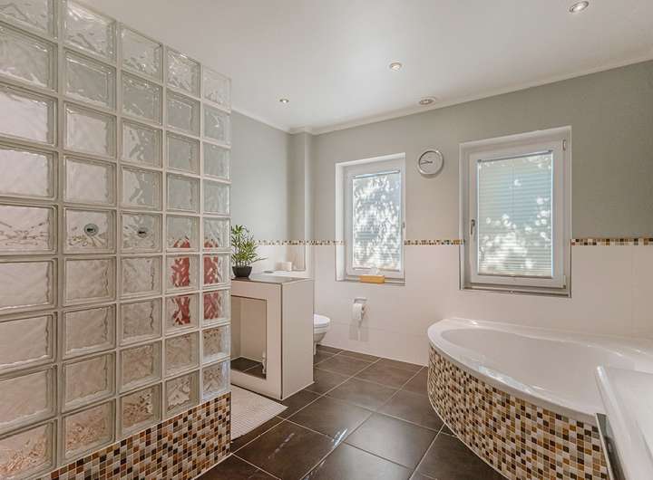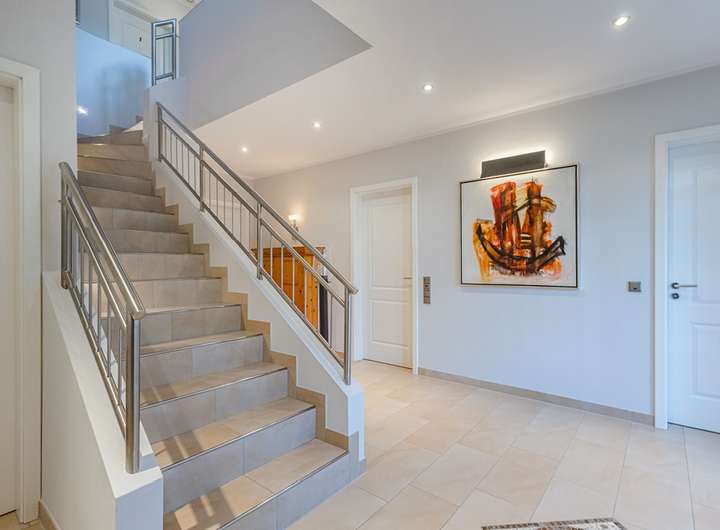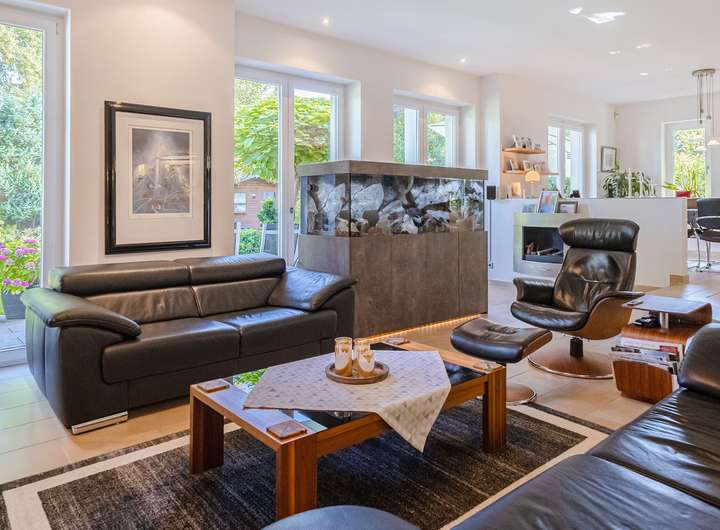 Bei der angebotenen Immobilie handelt es sich um eine sehr moderne und großzügig ausgestattete KfW60 Stadtvilla, deren tatsächlicher Energiewert deutlich niedriger ist und die erst vor wenigen Jahren von der renommierten Firma ID-Bau in solider Bauweise errichtet wurde, so dass sie vom Erwerber ohne zusätzlichen Renovierungsaufwand bzw. ohne weitere Investitionen bezogen werden kann. Sowohl der Zustand des Hauses als auch des Grundstücks ist darüber hinaus als außerordentlich gepflegt zu bezeichnen. Aufgrund der vielen, bodentiefen Fensterelemente bietet der groß proportionierte Wohnbereich tolle Sichtverhältnisse in den liebevoll und hochwertig angelegten Garten mit automatischer Bewässerung, Mähroboter und beleuchtetem Brunnen. Das Objekt hat keinerlei Schrägen, so bietet auch das Obergeschoss optimale Raumverhältnisse bei bester Belichtung.