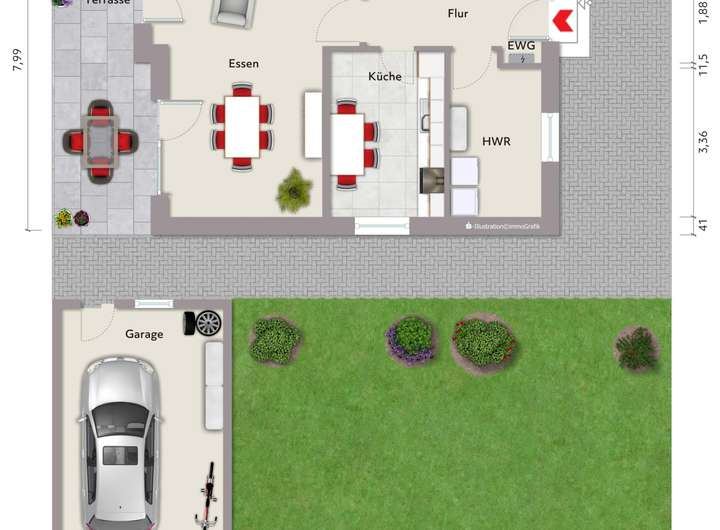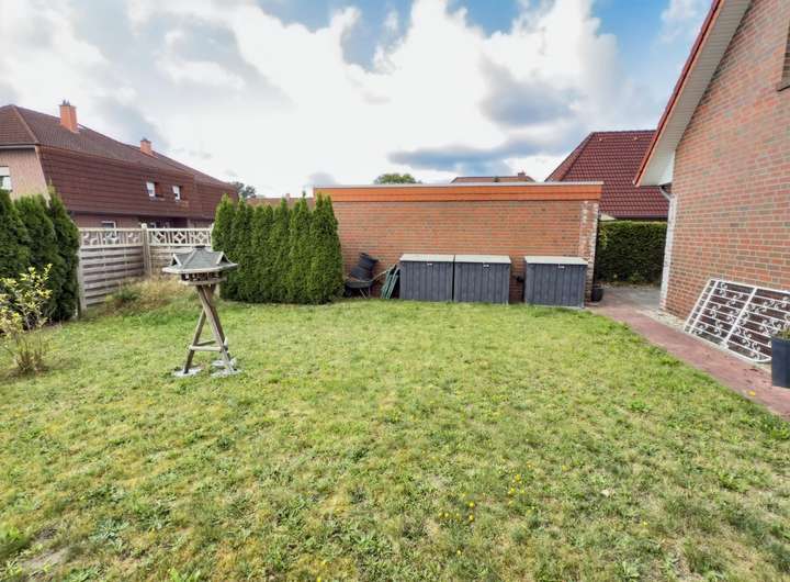 Das Grundstück mit einer Größe von 341 m² umfasst einen eingezäunten eigenen Garten, sowie eine überdachte Terrasse, die zu entspannten Stunden im Freien einlädt. Eine massive Garage mit ca. 35 m² bietet ausreichend Platz für Ihr Fahrzeug und zusätzlichen Stauraum.
