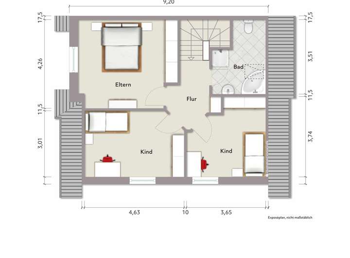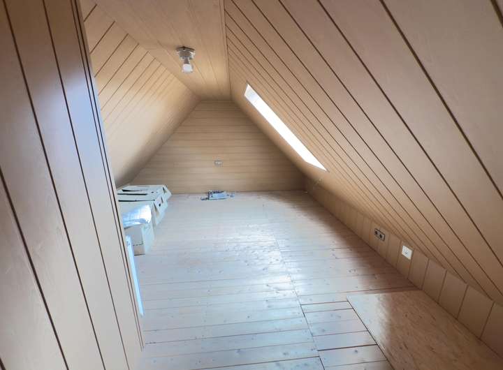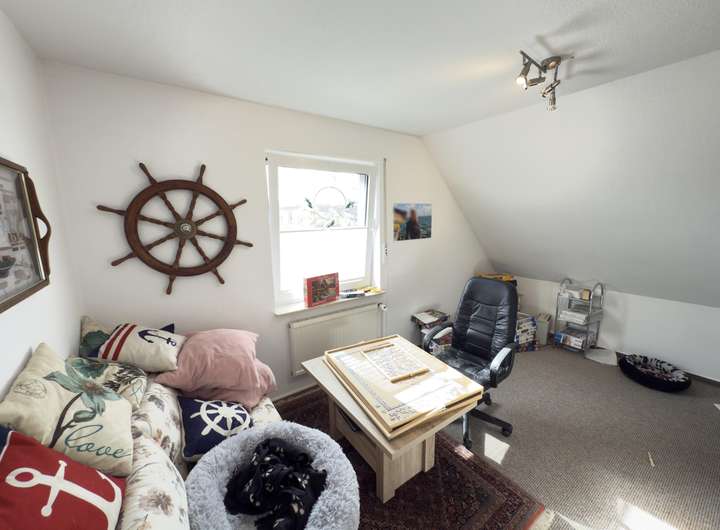Im Dachgeschoss befinden sich drei weitere Zimmer, die vielseitig genutzt werden können – sei es als Schlafzimmer, Arbeits- oder Kinderzimmer. Der gedämmte Spitzboden bietet zusätzliche Nutzfläche und eröffnet weitere Gestaltungsmöglichkeiten.