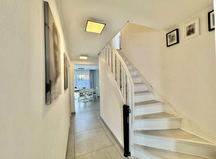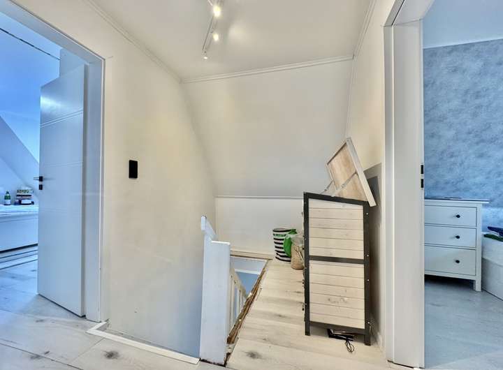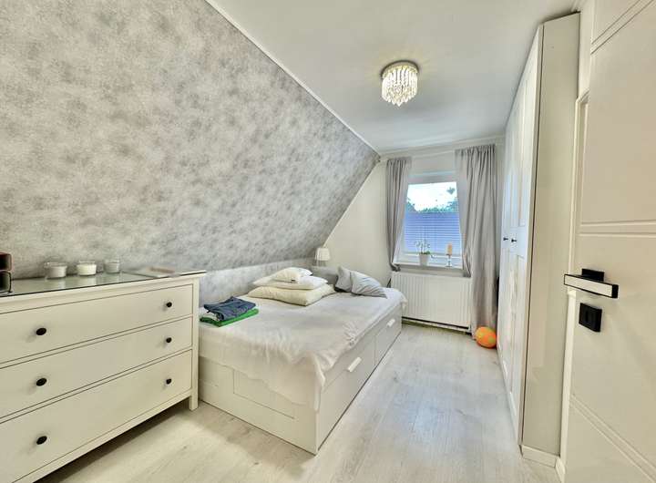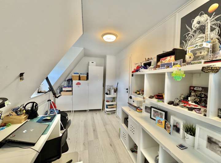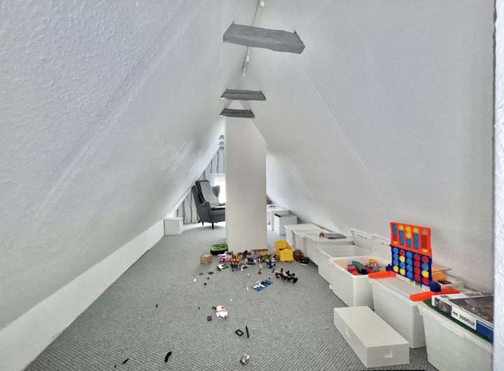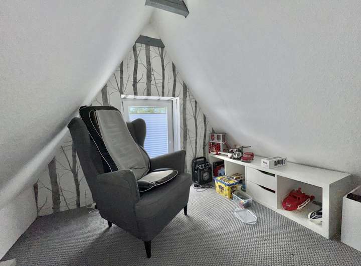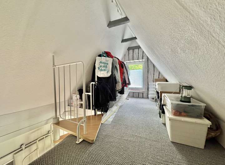 Der ausgebaute Spitzboden ist über eine Raumspartreppe im Schlafzimmer zu erreichen.