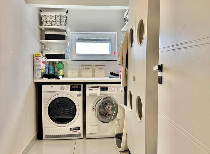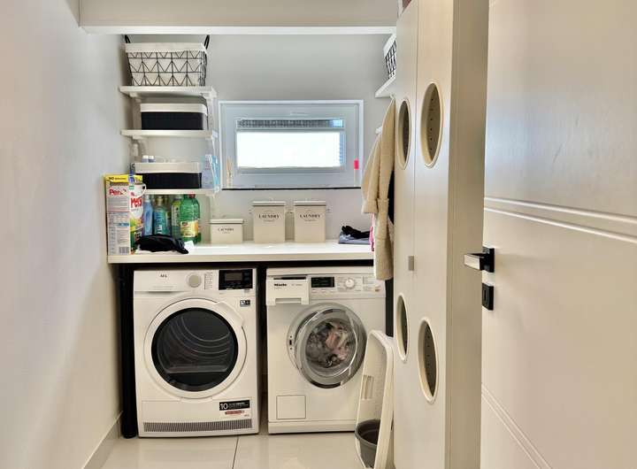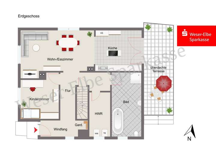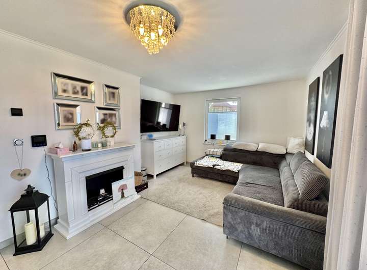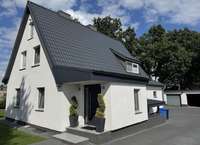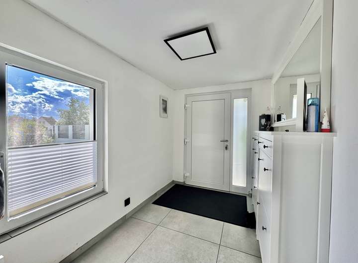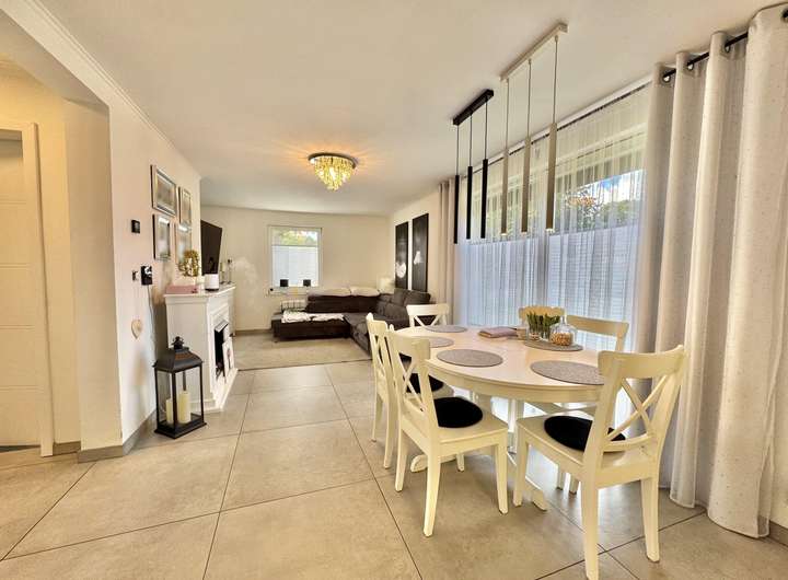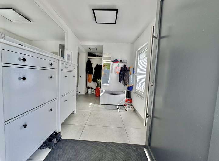Im Erdgeschoss warten auf ca. 72 m² Wohnfläche der helle Windfang mit Garderobe, der Flur mit Treppe in das Dachgeschoss, das großzügige Wohn-/Esszimmer, die zum Wohn-/Esszimmer offene Küche, ein Kinderzimmer, ein großes Bad mit freistehender Badewanne, bodengleicher Dusche, Waschbecken und WC sowie ein Hauswirtschaftsraum mit Fenster mit Platz für Waschmaschine und Trockner auf den neuen Besitzer.