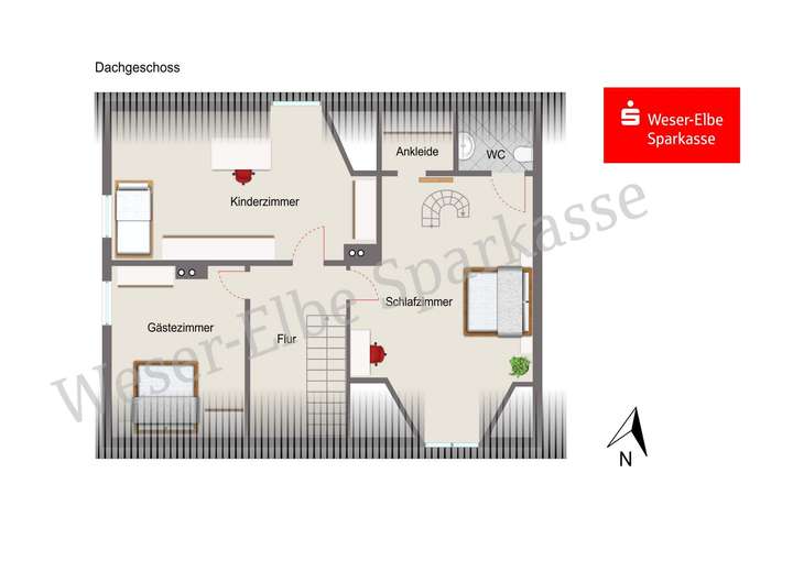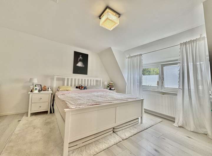 Das Dachgeschoss mit ca. 47 m² Wohnfläche verfügt über ein großes Schlafzimmer mit angeschlossener Ankleide und eigenem WC, einen Flur und 2 weiteren Zimmern.