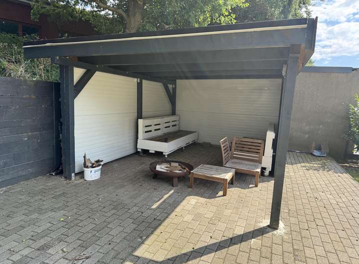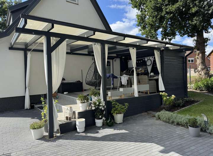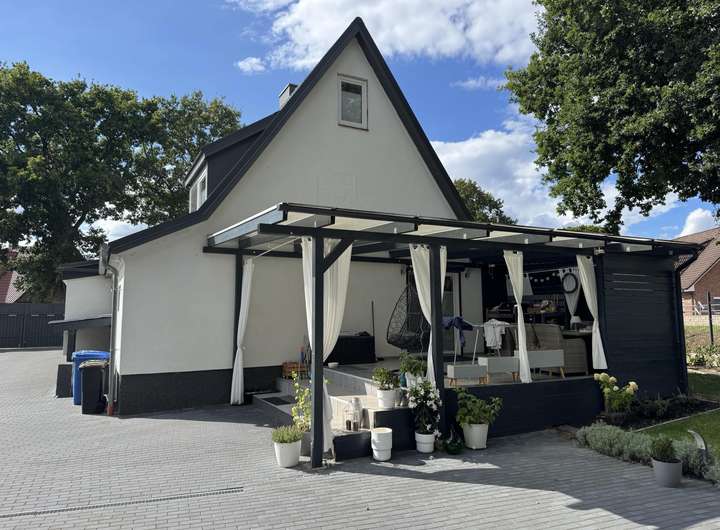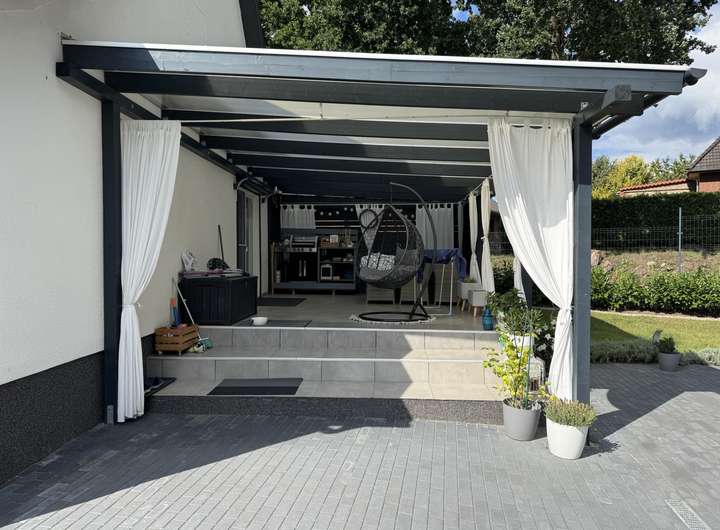 Von der Küche kann die große überdachte Terrasse betreten werden. Diese lädt zum Entspannen und Verweilen ein.