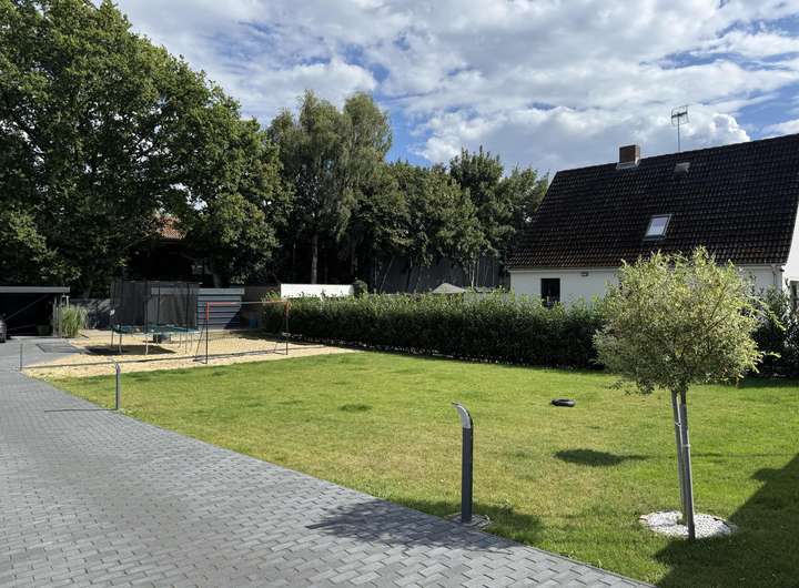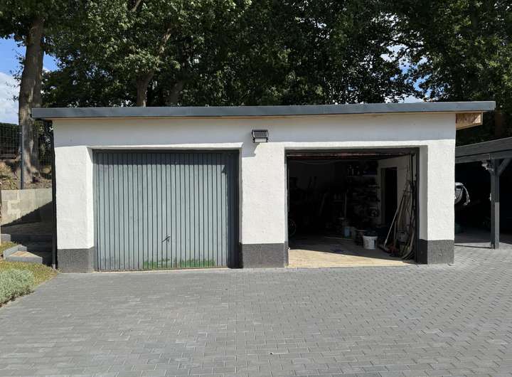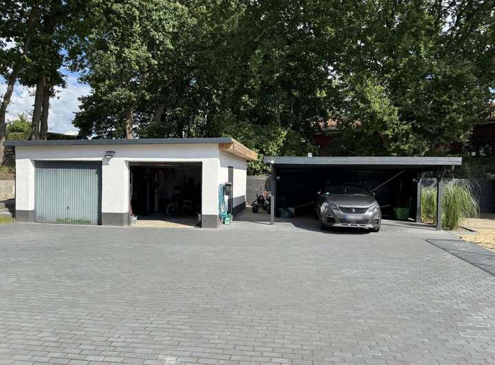 Auf dem großen Grundstück mit ca. 1.261 m² befinden sich eine Doppelgarage, ein Carport sowie ein überdachter Freisitz und ein Brunnen.