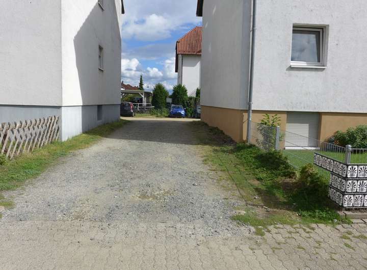 Zum Haus gehören insgesamt sieben Stellplätze hinter dem Gebäude sowie eine Garage mit Stromanschluss. Neben den privaten Kellerräumen stehen den Bewohnern ein Heizungsraum sowie ein gemeinschaftlicher Trockenraum zur Verfügung. Vor und hinter dem Gebäude befinden sich kleine Gartenflächen, die von den Bewohnern genutzt werden können. Die Zufahrt zum Hof erfolgt über eine gemeinschaftlich genutzte Einfahrt mit dem angrenzenden Nachbargrundstück.