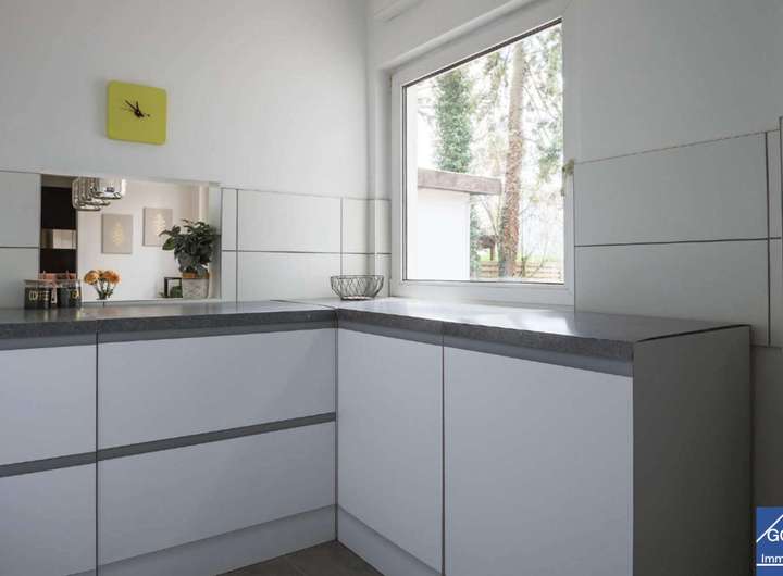 Eine Küche, sowie ein geräumiges Tageslichtbad mit Badewanne, Dusche, Doppelwaschbecken und Gäste-WC finden Sie ebenfalls im Erdgeschoss.