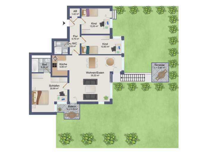 Die im Hochparterre gelegene Immobilie besticht besonders durch ihre funktionale und durchdachte Grundrissgestaltung und bietet Ihnen eine Wohnfläche von ca. 109 m² incl. Balkon und Terrasse. Zur Wohnung gehört ein schöner Gartenanteil mit Terrasse, den Sie über eine Treppe vom Wohnzimmer aus erreichen. Dieser Gartenanteil ist als Sondernutzungsrecht zugeordnet.