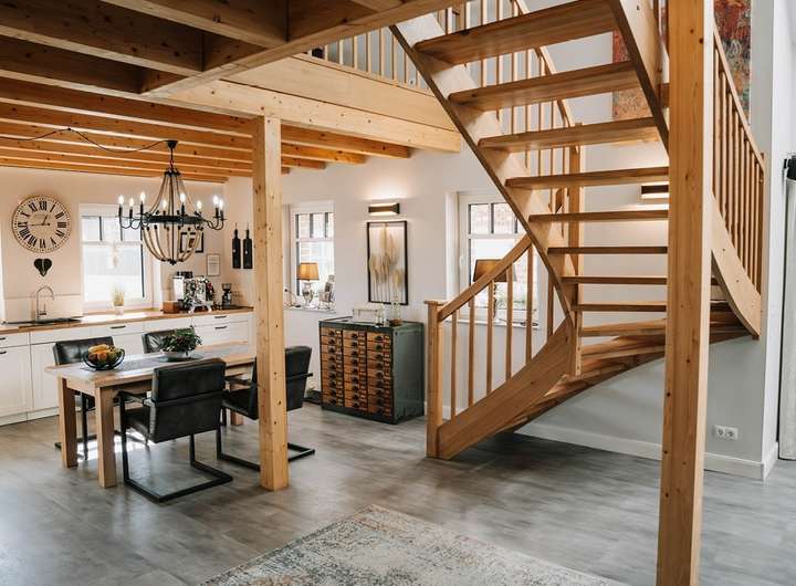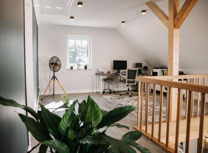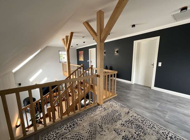 Mit aktuell drei Zimmern ist das Haus perfekt auf Paare oder kleine Familien zugeschnitten. Dank durchdachter Planung lässt sich im Dachgeschoss unkompliziert ein weiteres Zimmer realisieren – ideal als Kinderzimmer, Büro oder Gästezimmer. Das Dachgeschoss erreichen Sie über eine massive Eichentreppe, die dem Wohnraum zusätzlich einen warmen, natürlichen Charme verleiht. Besonders praktisch: das Schlafzimmer im Erdgeschoss bietet barrierefreies, altersgerechtes Wohnen mit traumhaftem Ausblick ins Grüne.
