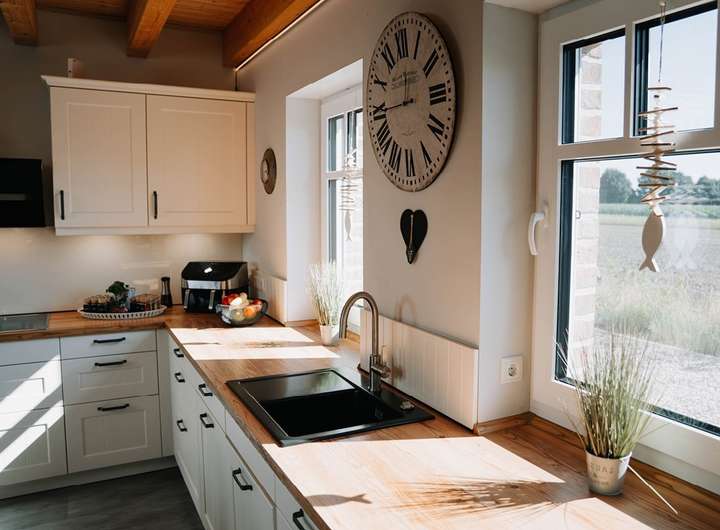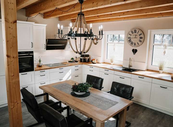Die moderne Landhausküche im zeitlosen Design fügt sich harmonisch in den Wohnbereich ein und eröffnet den Blick auf die umliegenden Felder. Hier wird Kochen zum Genuss und Zusammenkommen zum Erlebnis.