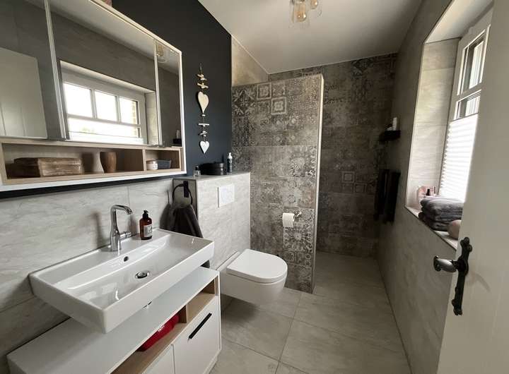 Die Ausstattung überzeugt bis ins letzte Detail: drei moderne Bäder, allesamt mit ebenerdigen Duschen und großformatigen, edlen Fliesen ausgestattet, bieten höchsten Komfort. Für eine wohnliche Wärme sorgt die Fußbodenheizung im gesamten Haus. Eine zentrale Be- und Entlüftungsanlage, sowie die moderne Luft-Wasser-Wärmepumpe ergänzt das energieeffiziente Konzept und schafft ein dauerhaft angenehmes Raumklima.