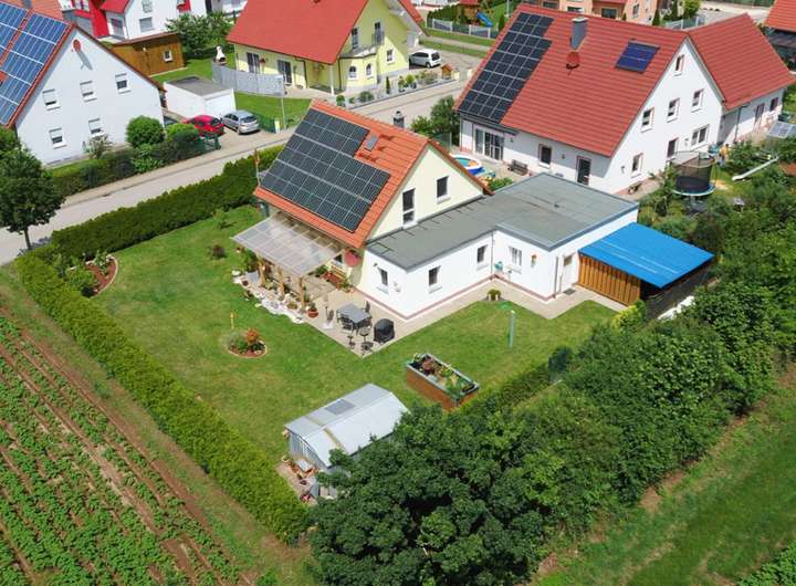 In 2020 wurde eine Photovoltaikanlage (7,35 kWp) inkl. Batteriespeicher für den Haushaltsstrom und Einspeisung ins Stromnetz installiert. Das spart ca. 700 € Stromkosten in einem durchschnittlichen 4 Personen Haushalt. In der Garage wurde eine Wallbox installiert, mit der ein KFZ über das Stromnetz als auch mit dem erzeugten Strom der Photovoltaikanlage geladen werden kann.