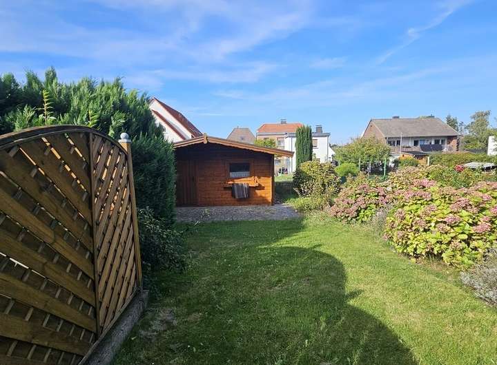 Eingangsflur mit Garderobe, Küche mit hochwertiger Einbauküche, Schlafzimmer, modernes Badezimmer mit Dusche, Badewanne und WC, Wohn- Esszimmer mit angrenzender Terrasse und Zugang zum Garten.