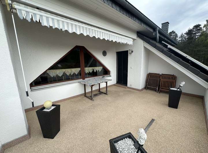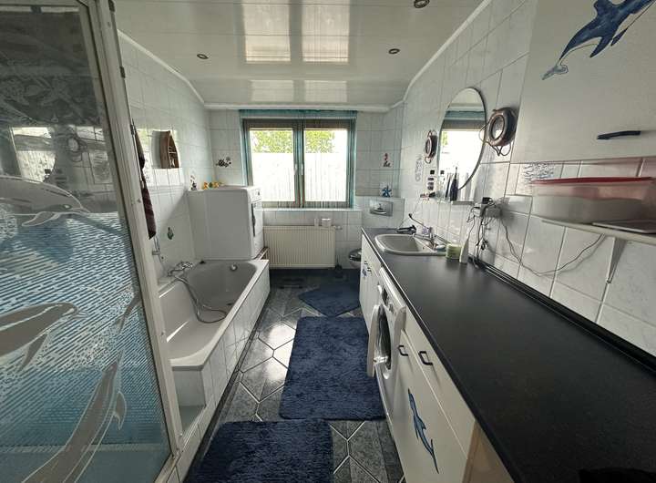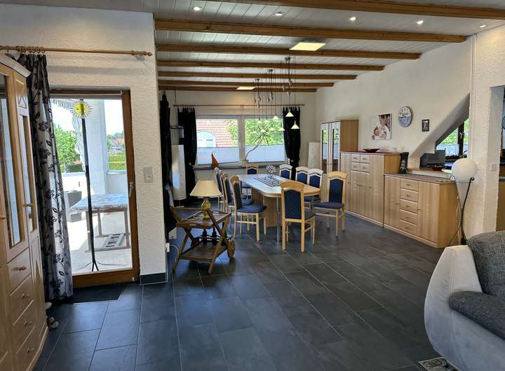 Obergeschoss: Die obere Wohnung verfügt über einen separaten Zugang von außen. Sie bietet 4 Zimmer, einen Abstellraum, ein Schlafzimmer mit Klimaanlage, einen großzügigen Wohn- und Essbereich sowie ein Badezimmer mit Dusche und Wanne, ebenfalls mit Anschlüssen für Waschmaschine und Trockner ausgestattet. Ein wasserführender Kamin sorgt für wohlige Wärme. Die Dachterrasse lädt zum Verweilen ein.