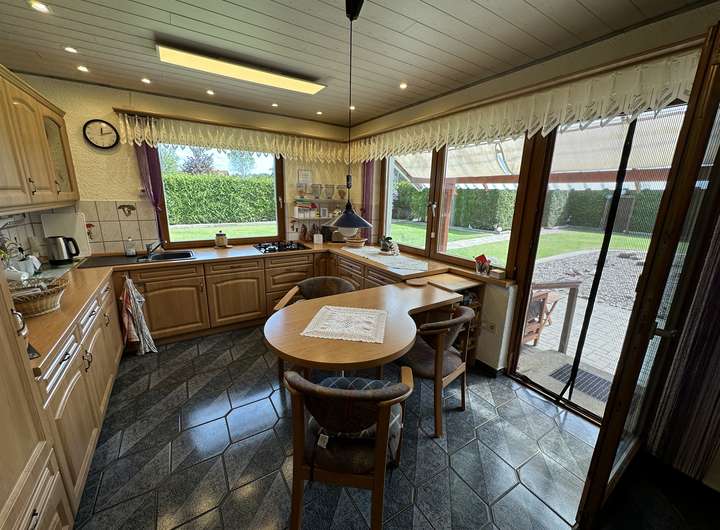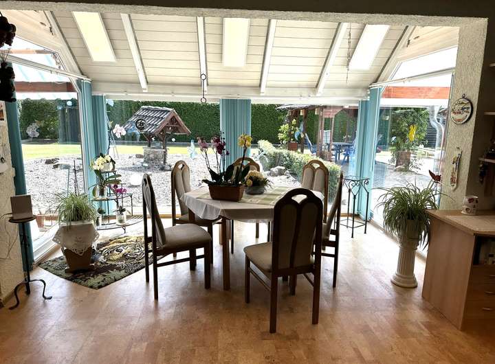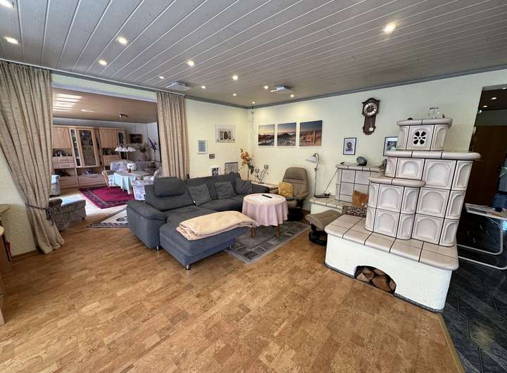 Erdgeschoss: Die Erdgeschosswohnung umfasst 4 Zimmer mit einem großzügigen Garderobenbereich. Ein Hauswirtschaftsraum mit Durchgang zur Doppelgarage sorgt für Komfort. Die Küche beeindruckt mit großen Fensterfronten und bietet einen direkten Zugang zum Garten. Das Badezimmer verfügt über Fußbodenheizung, eine Wanne, eine Dusche sowie Anschlüsse für Waschmaschine und Trockner. Das Wohnzimmer wird durch einen Kachelofen beheizt und grenzt an das Esszimmer. Ein gemütlicher Wintergarten rundet das Angebot ab.