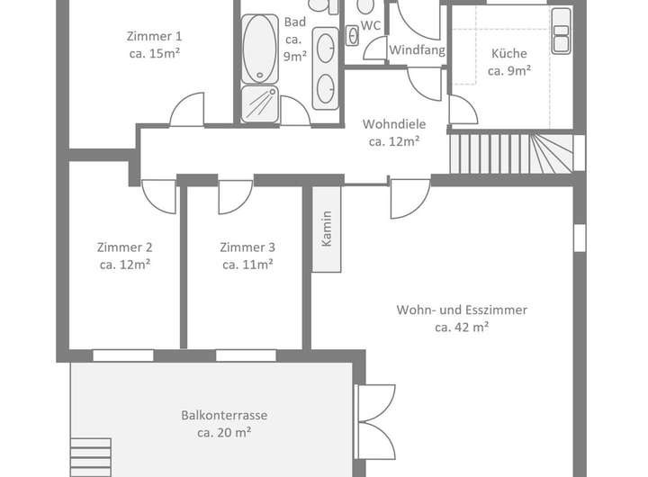 Den Mittelpunkt im Erdgeschoss bildet der Wohn- und Essbereich, an den eine großflächige, windgeschützte Balkonterrasse grenzt, die Zugang zum Garten bietet. Auf der stolzen Größen von 20 m² lässt sich nicht nur der Feierabend mit Blick ins Grüne genießen, sie bietet auch Platz für Grill, Sonnenliegen und Gäste.