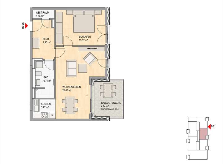 Entdecken Sie Wohnungen mit durchdachten Grundrissen, die Raum für vielfältige Lebensentwürfe bieten. Helle Wohnbereiche schaffen eine angenehme Atmosphäre, ergänzt durch sorgfältig gestaltete Funktionsräume. Balkone/Loggien oder Terrassen laden zu entspannten Momenten im Freien ein.