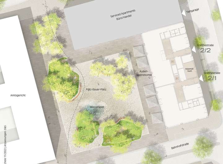 Trotz zentraler Lage bietet das Goethe-Quartier ausreichend Ruhe und Erholung. Der neu gestaltete Fritz-Bauer-Platz ist eine grüne Oase mitten im urbanen Raum. Großzügige Grünflächen, schattige Plätze und gemütliche Sitzgelegenheiten machen den Platz zu einem perfekten Ort, um den Alltagsstress hinter sich zu lassen und neue Kraft zu tanken.