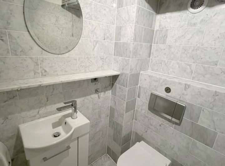Im Erdgeschoss des linken Hauses mit einer Gesamtfläche von 137,5 m² befindet sich das Badezimmer, sowie ein weiteres Zimmer.
