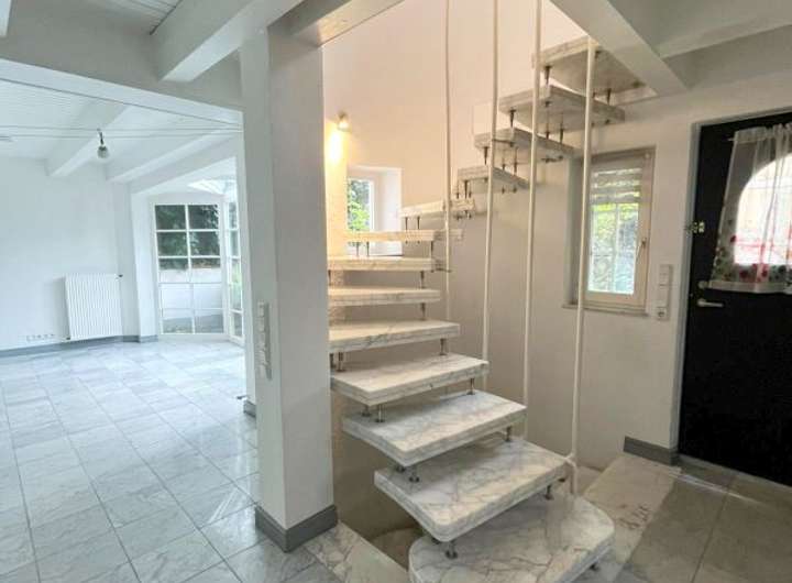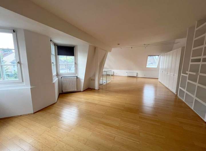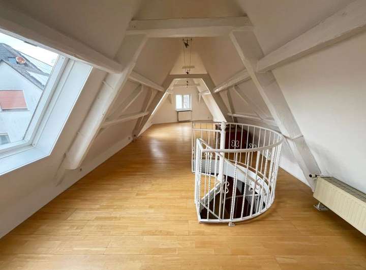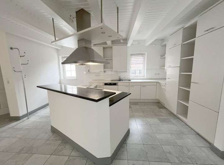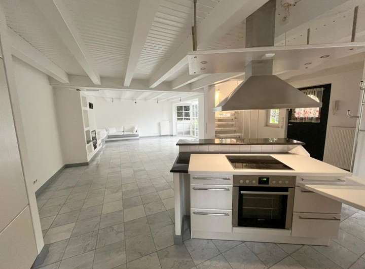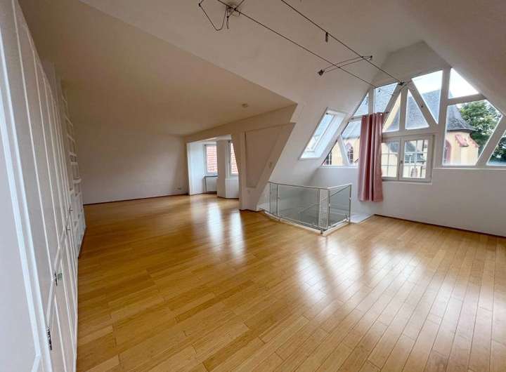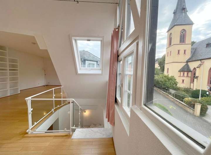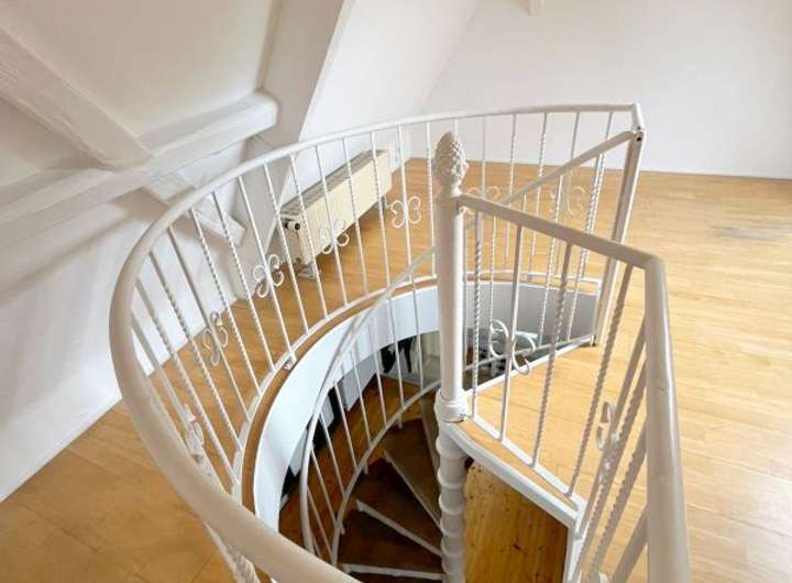 Im 1. Obergeschoss befindet sich ein großzügiger, offener Wohn- und Essbereich, der durch eine stilvolle Loggia ergänzt wird. Hier befindet sich zudem eine moderne Küche. Nimmt man von hier aus die stillvolle Wendeltreppe nach oben, so gelangt man in ein beeindruckendes Studio mit weitläufiger Fläche und offenem Charakter im Dachgeschoss.