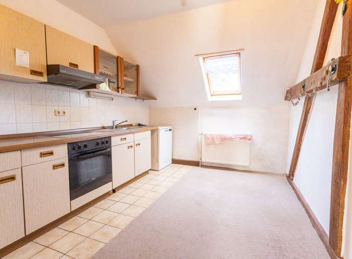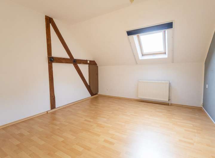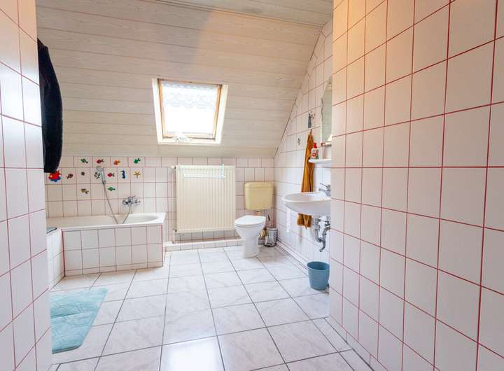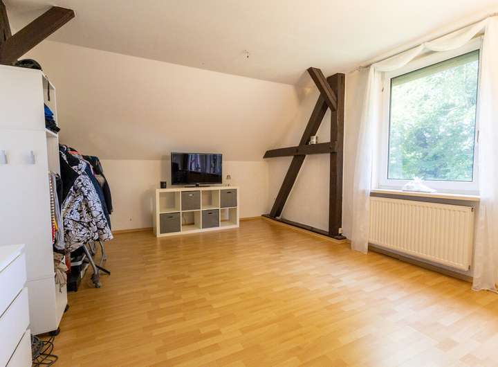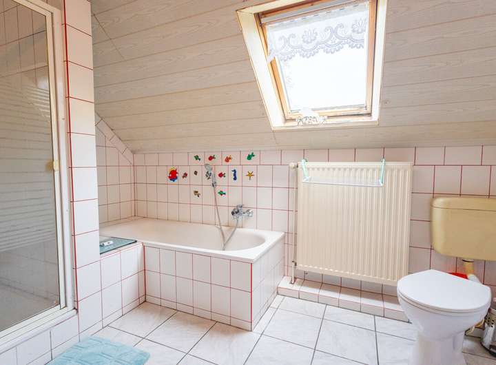 Das Dachgeschoss wurde zusätzlich ausgebaut und beherbergt vier weitere Zimmer, ein Badezimmer, ein Gäste-WC sowie eine separate Küche. Durch diese Aufteilung bietet sich die Möglichkeit, das Obergeschoss abzugrenzen und beispielsweise als Einliegerwohnung zu nutzen oder zu vermieten. Ein separater Eingang ist bereits vorhanden, sodass sich die Umsetzung unkompliziert und mit überschaubarem Aufwand gestalten lässt.