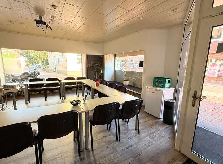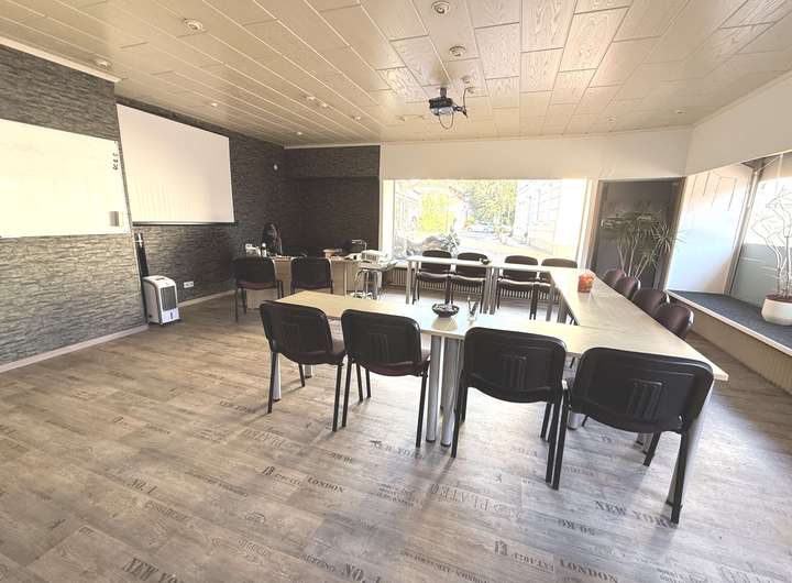 Im Erdgeschoss befinden sich die Büroräume einer ortsansässigen Fahrschule. Dazu gehört eine Personalküche, Badezimmer und Lager. Ein kleiner Garten ist auch vorhanden.