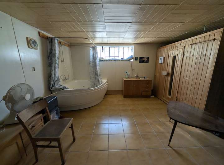 -Öl-Zentralheizung Baujahr ca. 1993 -Kunststofffenster mit Rollläden -Garage -Carport -überdachte Terrasse -Kleinkläranlage -Vollkeller -Badezimmer im OG und EG mit Badewanne -Badezimmer mit Sauna im Keller
