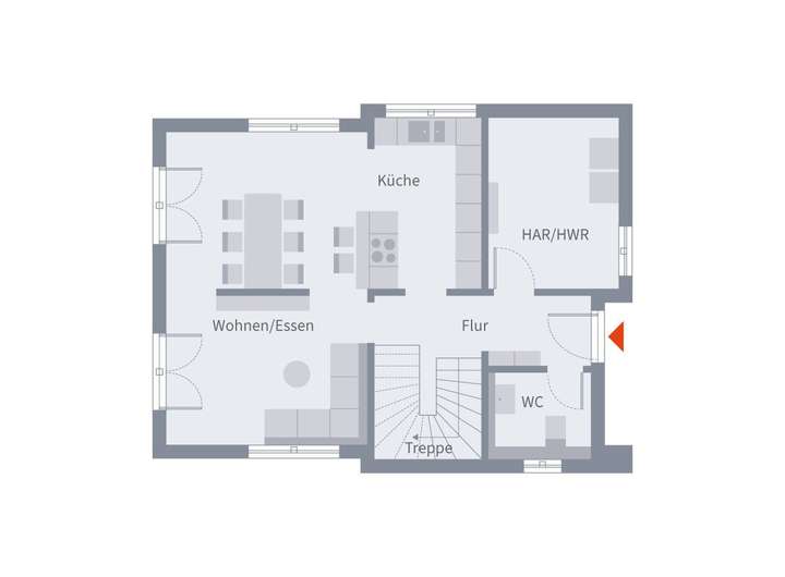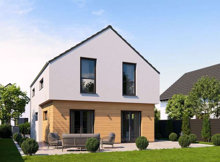 Schlichte Eleganz und ein durchdachtes Raumkonzept verleihen diesem Einfamilienhaus seine besondere Ausstrahlung. Die klare Linienführung der Architektur wird von einer zweifarbigen Fassadengestaltung betont, die Tiefe und Charakter schenkt. Im Inneren setzt sich diese Klarheit fort: Das Erdgeschoss öffnet sich zu einem lichtdurchfluteten Wohn-, Ess- und Kochbereich, der fließend in den Garten übergeht - ein Ort für lebendige Begegnungen und stille Augenblicke. Hauswirtschaftsraum und Gäste-WC sind dezent abgetrennt und sorgen für praktische Funktionalität. Von der großzügigen Diele führt eine Treppe ins Dachgeschoss, wo der Raum optimal genutzt ist: Ein helles Kinderzimmer, ein Elternschlafzimmer, ein Büro und ein komfortables Bad mit Wanne, Dusche und WC schaffen ein harmonisches Wohnumfeld. Auf rund 130 m² entsteht so ein Zuhause, das beständig Freude schenkt und Generationen verbindet.