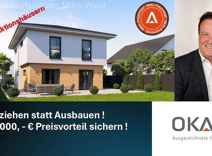 ***Aktion nur gültig bei Abschluss eines Hausvertrages für ein OKAL-Haus der Aktionsserie "Pur" bis zum 31.10.2025. Gutschein gültig für eine OKAL-Markenküche Schüller Halbinsel im Wert von 6.800 EUR inkl. Elektrogeräte.