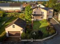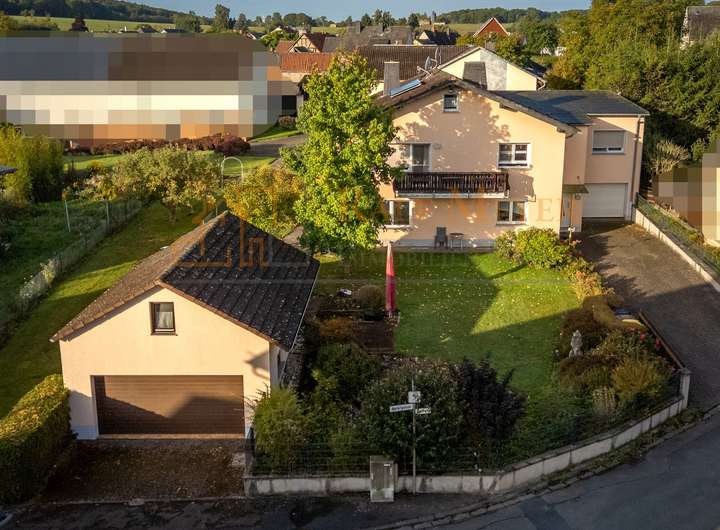 Zum Haus gehört ein ebenes Grundstück mit einer Doppelgarage mit zusätzlichem Hobbyraum im Dachgeschoss. Eine weitere Garage ist direkt vom Haus aus zu erreichen. Weitere Parkmöglichkeiten bietet der große Hof.