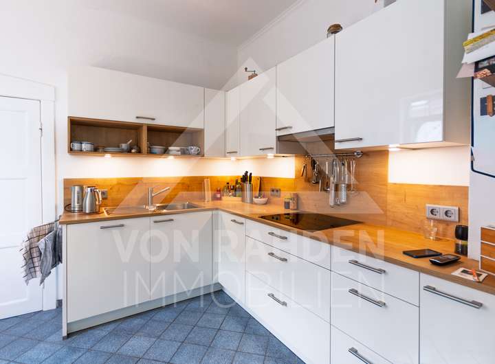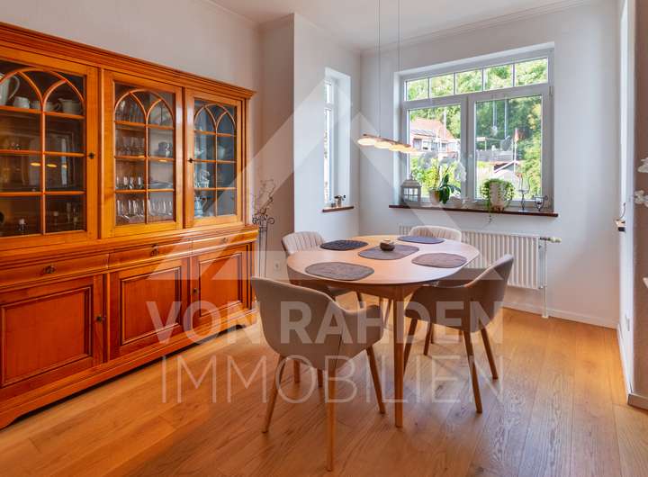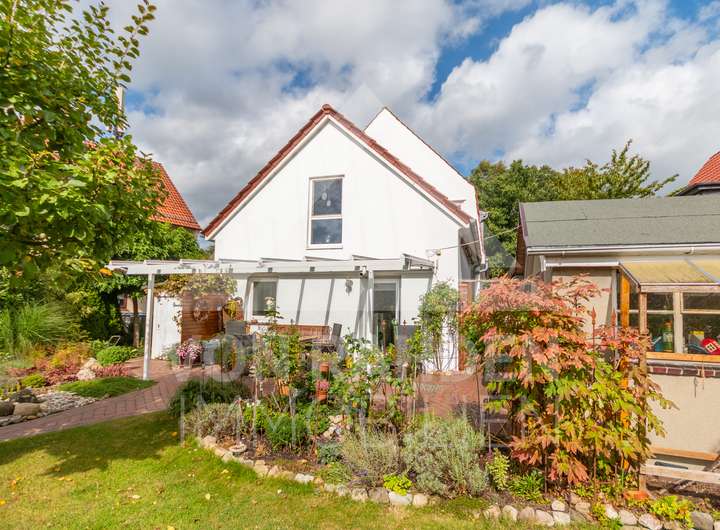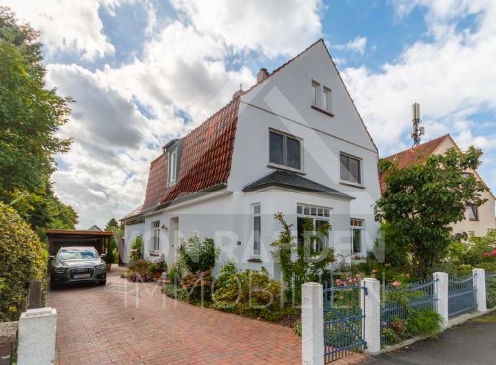 Dieses Einfamilienhaus ist ein echtes Schmuckstück: Auf ca. 160 m² Wohn- und Nutzfläche vereint sich der Charme der Gründerzeit mit modernem Landhausstil – und das mitten in der Stadt. Das schicke Objekt wurde durchgehend modernisiert und befindet sich in einem sehr gepflegten Zustand. Der Garten ist eine Freude für Pflanzenliebhaber, aber trotzdem durchaus pflegeleicht gestaltet. Das Haus verfügt auf ca. 160 m² Wohn- und Nutzfläche über 5-6 Zimmer, Küche, 2 Bäder, Gäste-WC und Hauswirtschaftsraum. Das Haupthaus wurde 1929 errichtet. Der Anbau wurde 2014 ausgebaut und erhielt eine neue Bedachung. Die weiße Putzfassade wurde 2022 neu gestrichen. Ebenfalls wurde bereits der Zwischenraum mit Perliten ausgeblasen. Die Gasheizung der Marke Viessmann stammt aus dem Jahr 2014. Warmwasser wird über die Zentralheizung erzeugt. 2012 und 2014 wurden die Fenster durch weiße Kunststofffenster z.T. mit Sicherheitsglas (RC2) erneuert. Im Teilkeller ist 1985 der Estrich erneuert worden. 2021 wurde die Wohnküche mit einer modernen, zeitlosen weißen Einbauküche ausgestattet. Vom gemütlichen Wohnzimmer mit Kaminofen und Eichenparkett im Erdgeschoss führt eine offene Treppe ins Dachgeschoss. Hier befinden sich ein Elternschlafzimmer mit Einbauschrank, zwei Kinderzimmer und ein Arbeits- und Hobbyzimmer. Außerdem gibt es ein modernes Badezimmer mit Dusche und WC. Der Garten ist pflegeleicht, aber charmant angelegt. Herzstück ist die große überdachte Terrasse. Hier kann man auch an kühleren Tagen gemütlich sitzen und die Natur genießen. Zum Außenbereich gehören ein Carport, ein Fahrradschuppen und ein Gerätehaus.